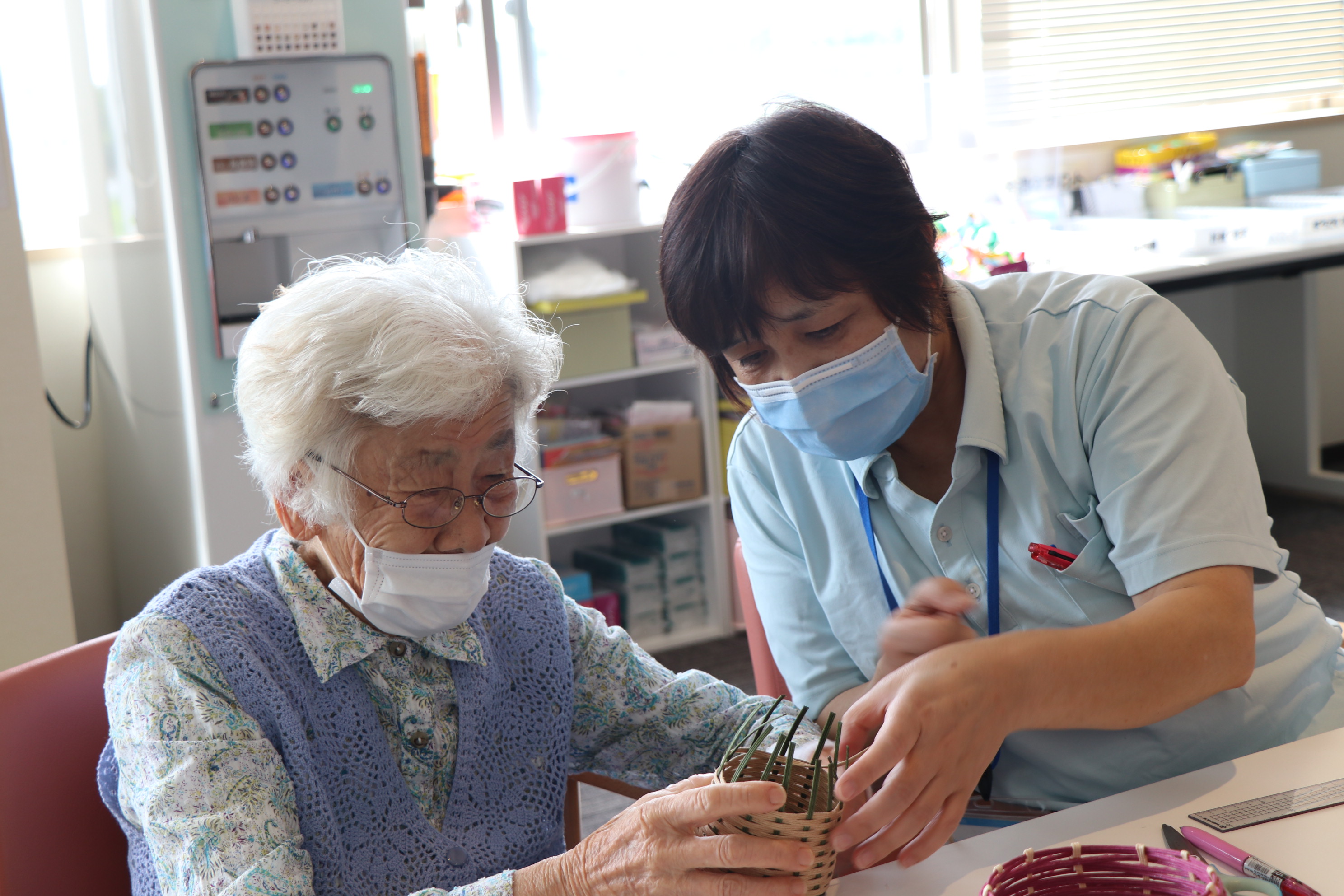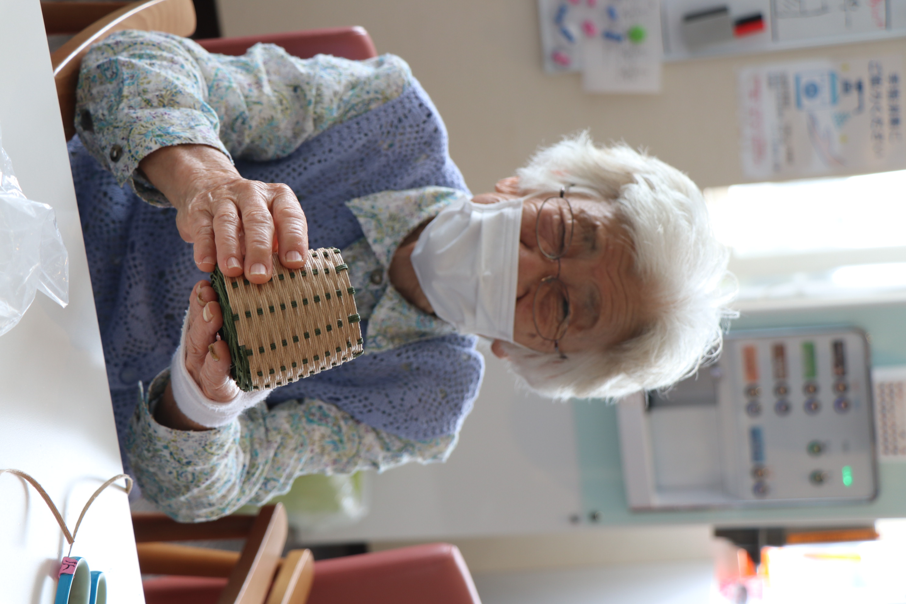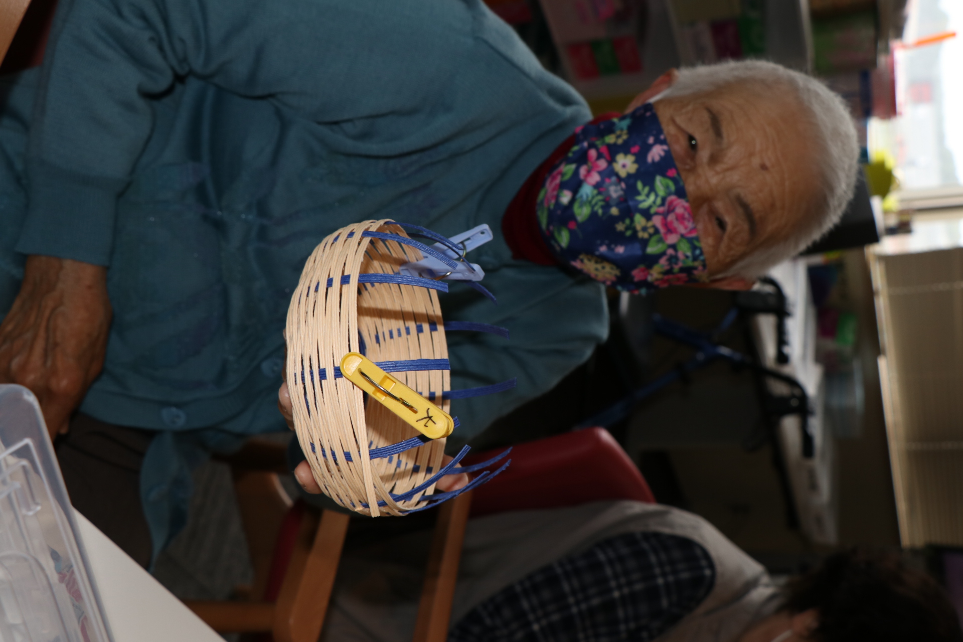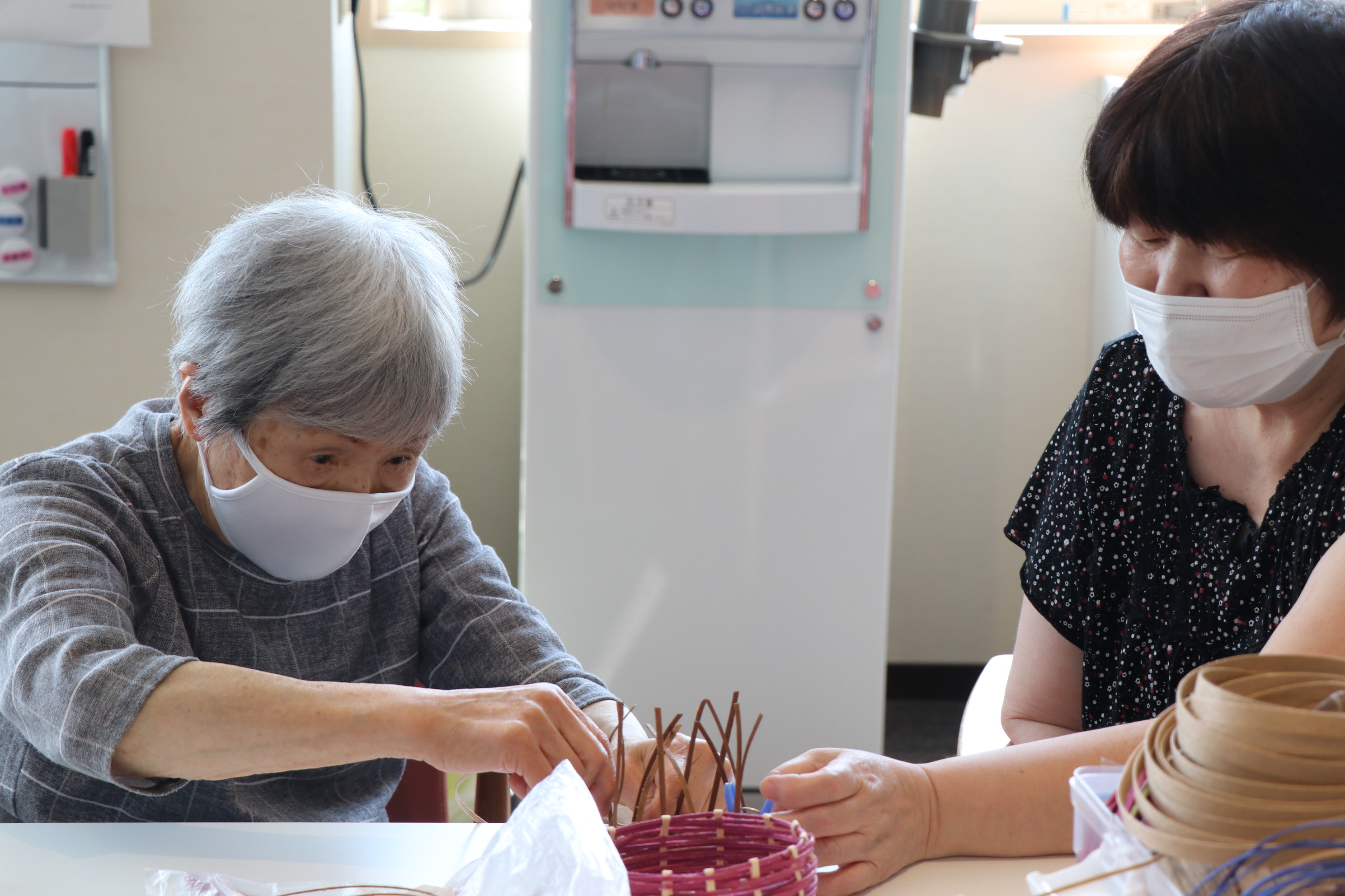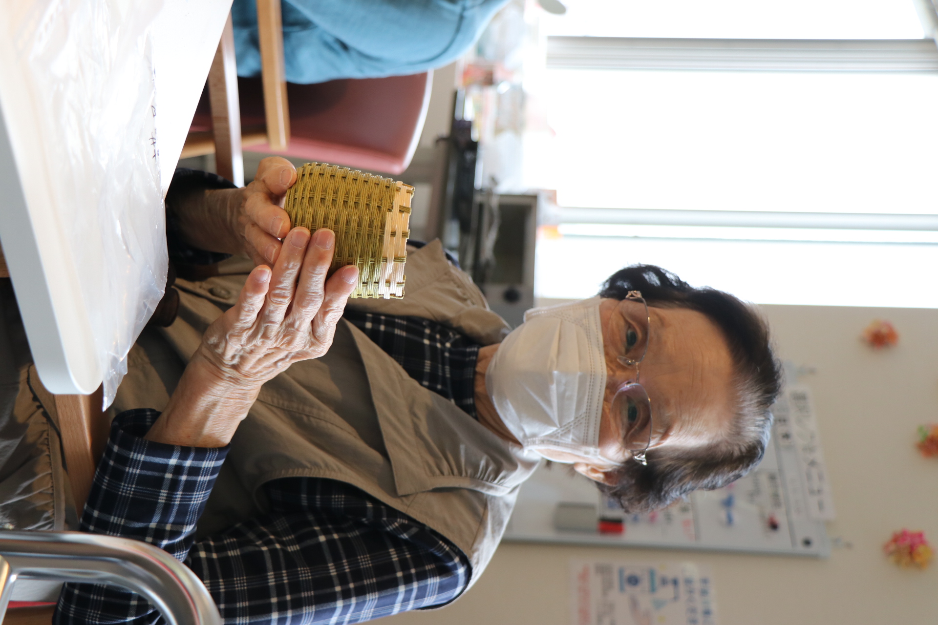 その中でも長く人気の高い個別レクリエーションのひとつに、「ペーパーバンド」を使って作る「編みかご」があります。