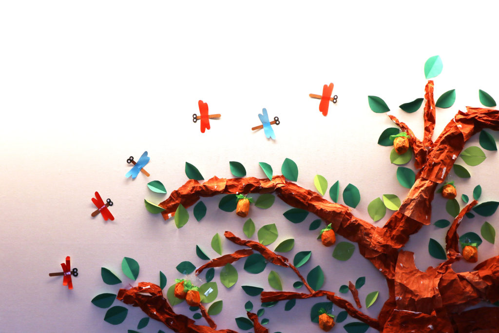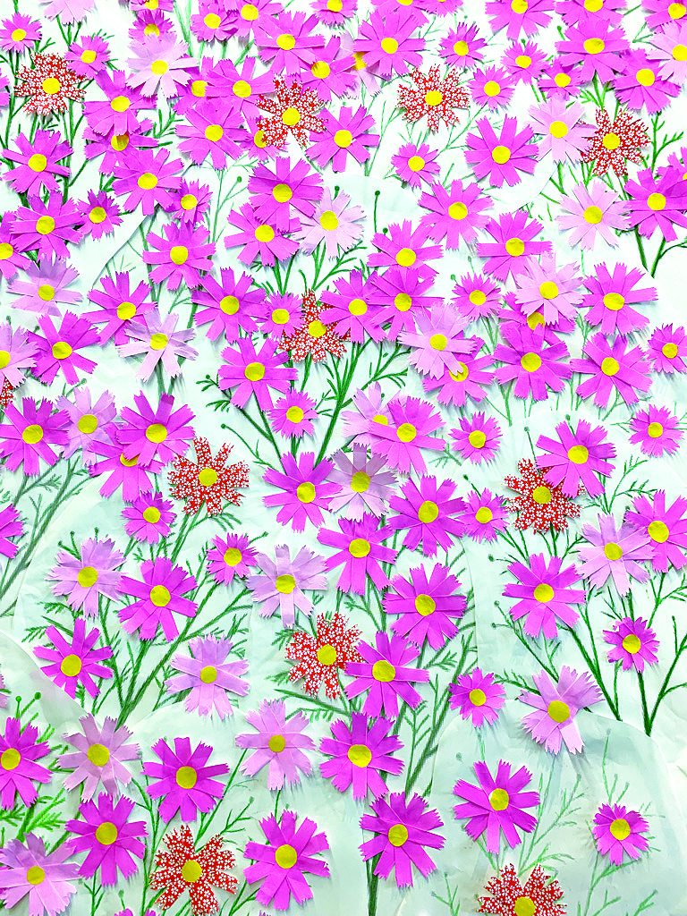 そしてデイケアルームの柱には、このページのサムネイル画像にも使用している手作りコスモスが沢山咲いています。
