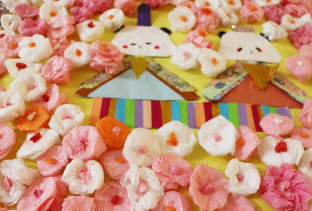 利用者さん達がひとつずつお花紙で作った桃の花がとても綺麗でキュートな仕上がりですね‼️