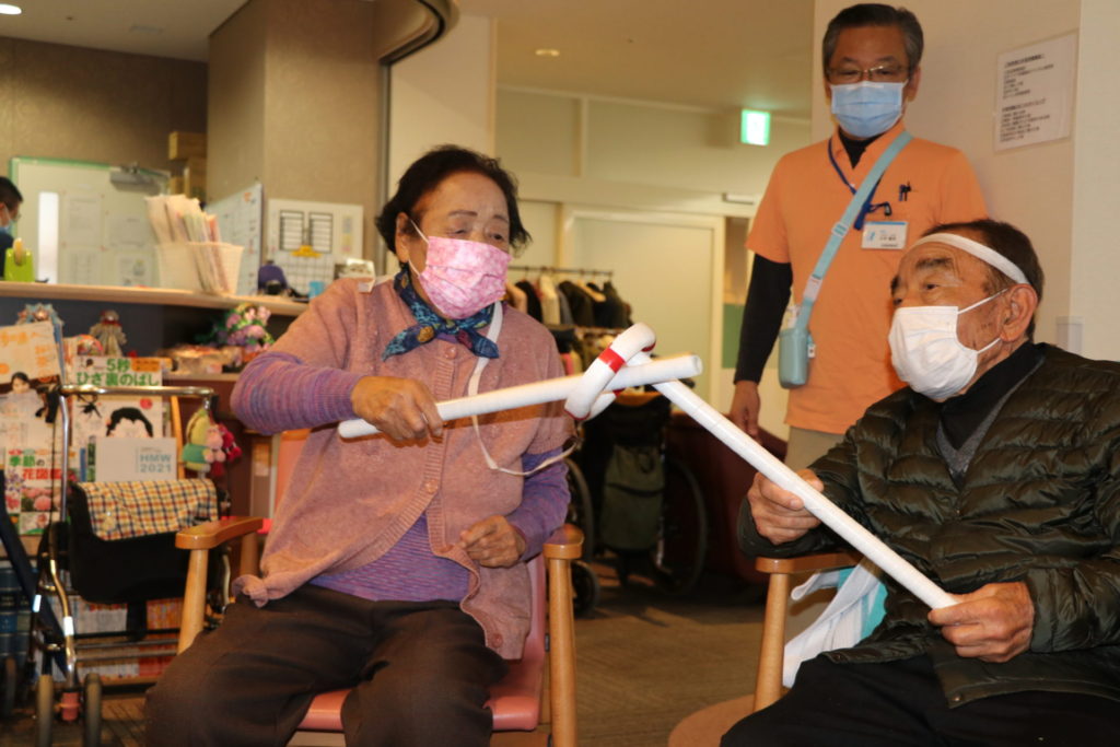 三種目目は発疱スチロールで出来た輪を手を使わずに棒で受け渡しをする「ハッポー・スチロールリレー」