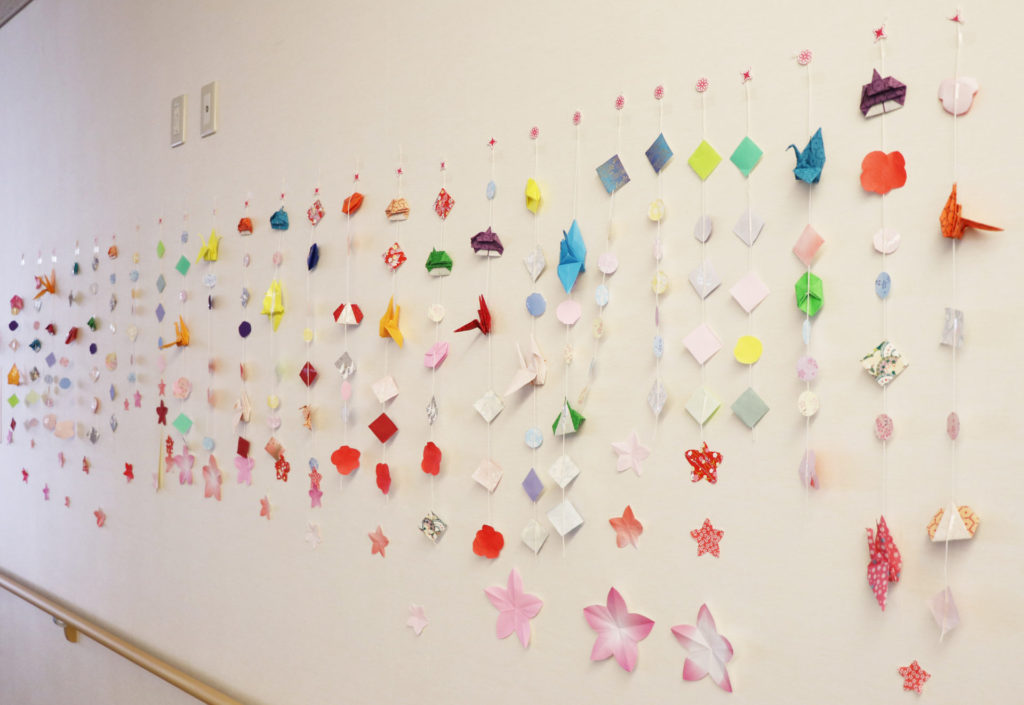 折り紙で思い思いの形に折ったり切ったりしてつなげてあります。