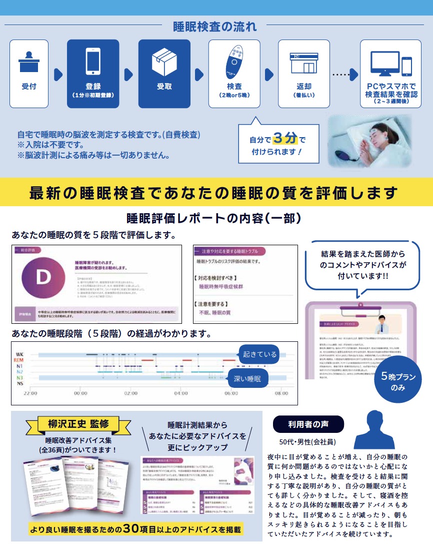 ご自宅に送られてくる検査キットをご自分で装着し、就寝中に脳波を調べることで、睡眠の質や不調の原因とリスク、改善方法を詳しく知ることができます。
