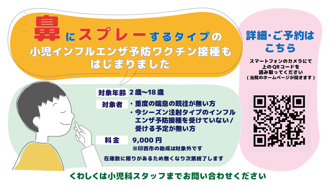 小児を対象とした点鼻タイプのインフルエンザワクチン接種の予約を受付しております。