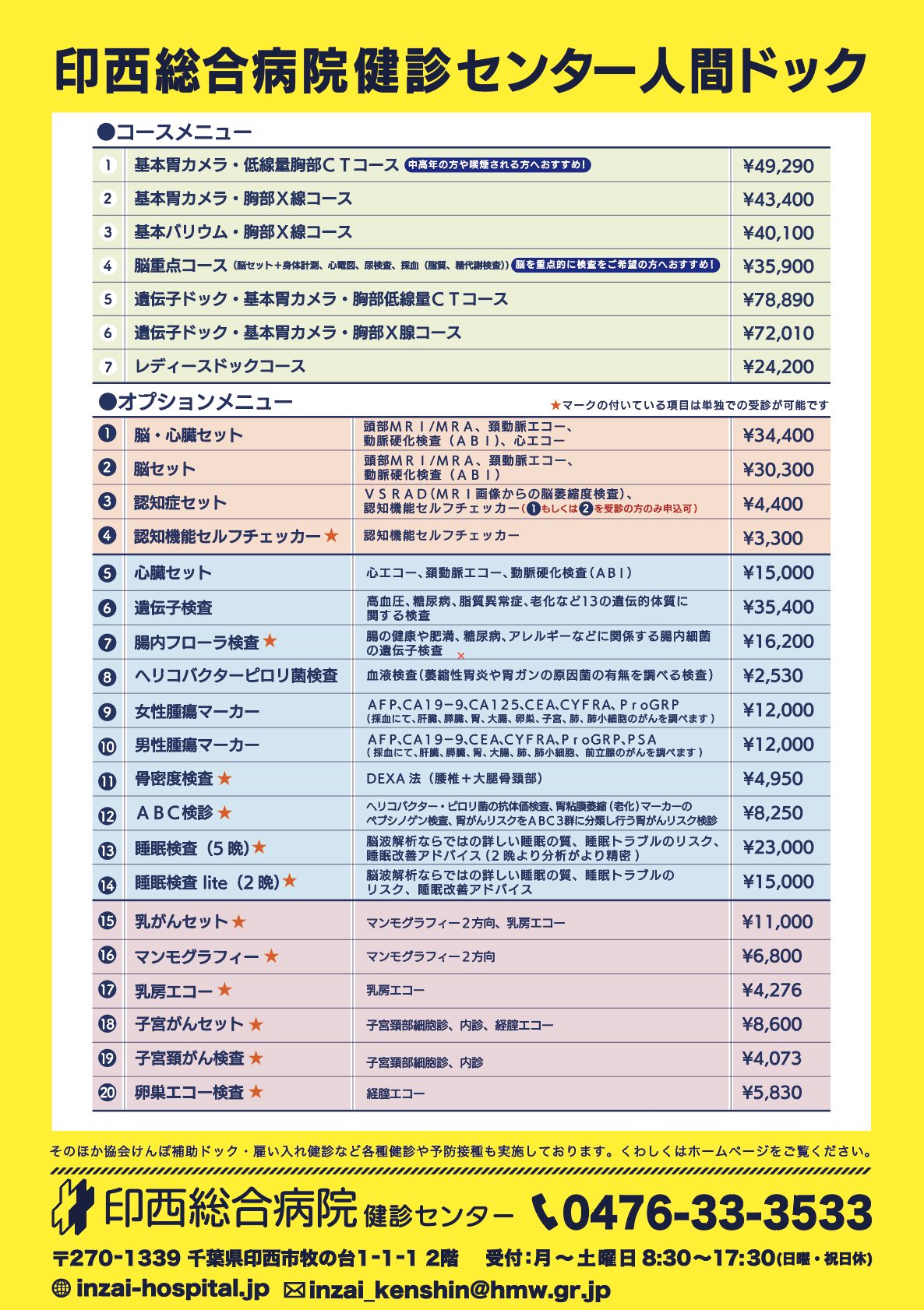 印西総合病院健診センターでは、印西市に住民票のある方で、印西市の特定健康診査および印西市の助成制度を利用した人間ドックを下記のWEBサイトで予約し、2025年10月31日(金)までに受診された方を対象に腫瘍マーカー3点分(通常6,000円相当のオプション)を無料で検査項目に追加するキャンペーンを実施中です。今年度未受診の方は、10月31日(金)までに受診をご検討ください。