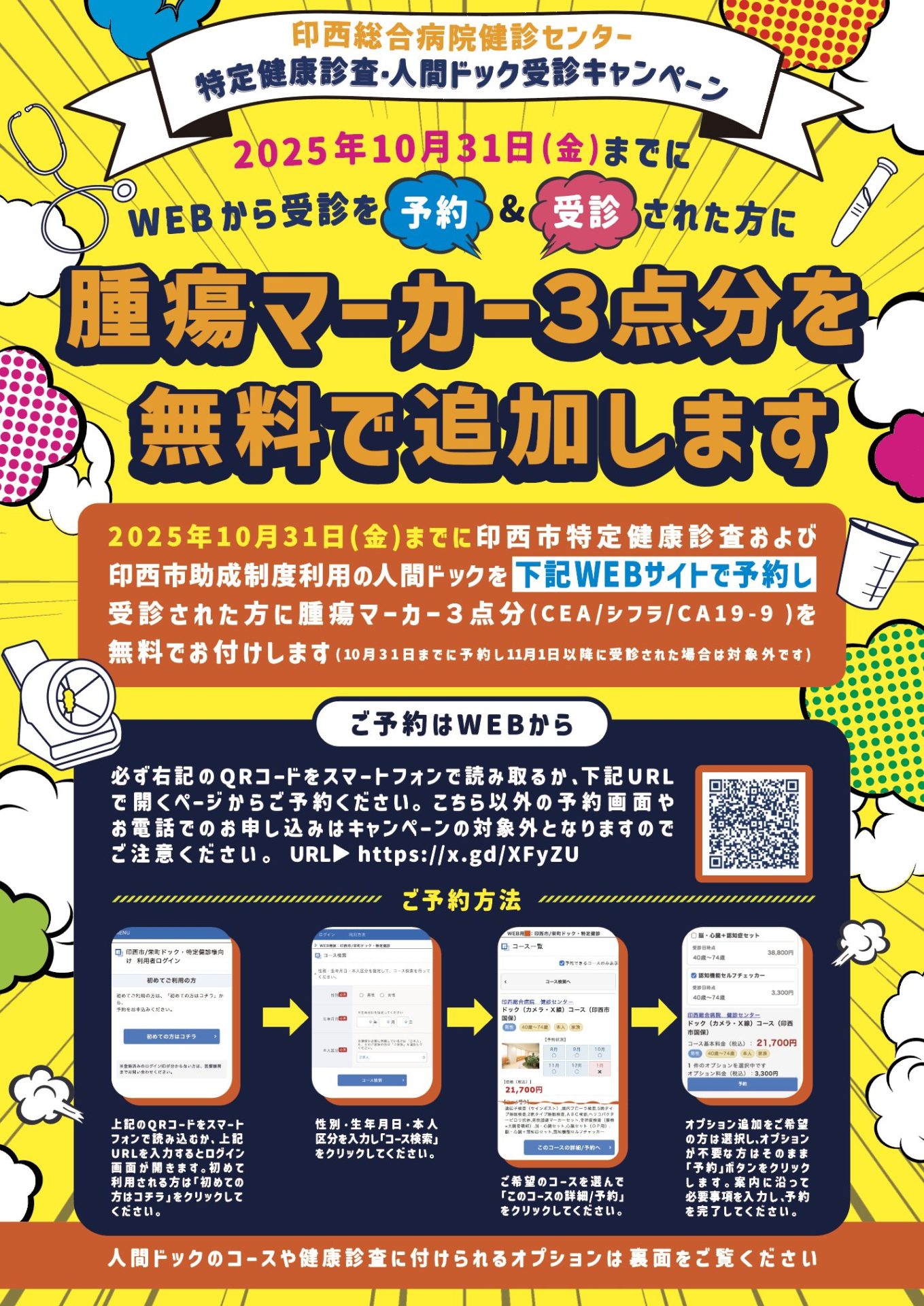 印西総合病院健診センターでは、印西市に住民票のある方で、印西市の特定健康診査および印西市の助成制度を利用した人間ドックを下記のWEBサイトで予約し、2025年10月31日(金)までに受診された方を対象に腫瘍マーカー3点分(通常6,000円相当のオプション)を無料で検査項目に追加するキャンペーンを実施中です。今年度未受診の方は、10月31日(金)までに受診をご検討ください。