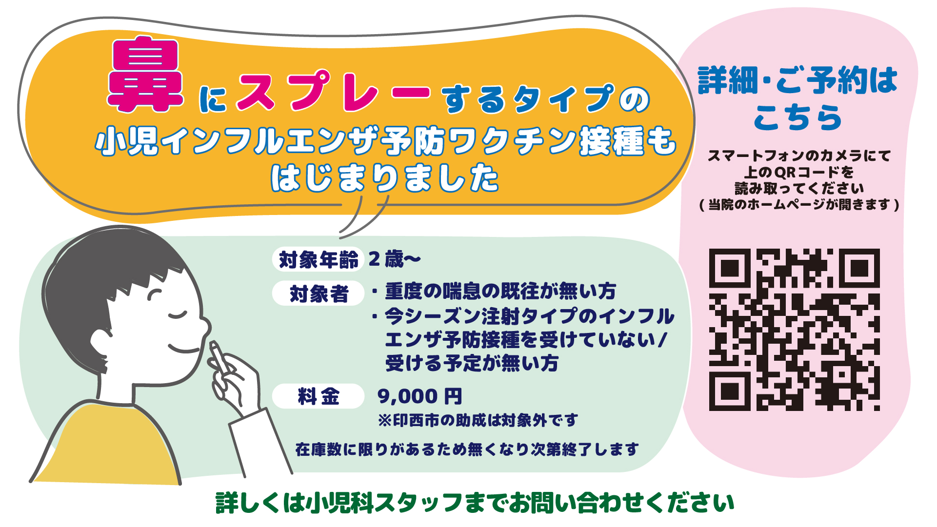 小児を対象とした点鼻タイプのインフルエンザワクチン接種の予約を受付しております。