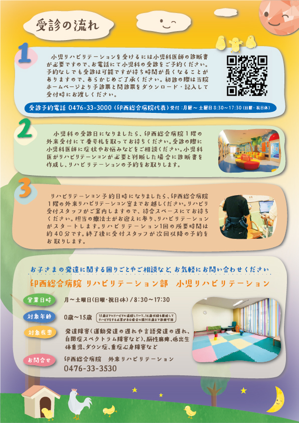 | 4 | 受診の際に、小児科医師に症状やお悩みなどをご相談ください。医師がリハビリテーションが必要と判断した場合に診断書を作成し、リハビリテーションの予約をお取りします。 |