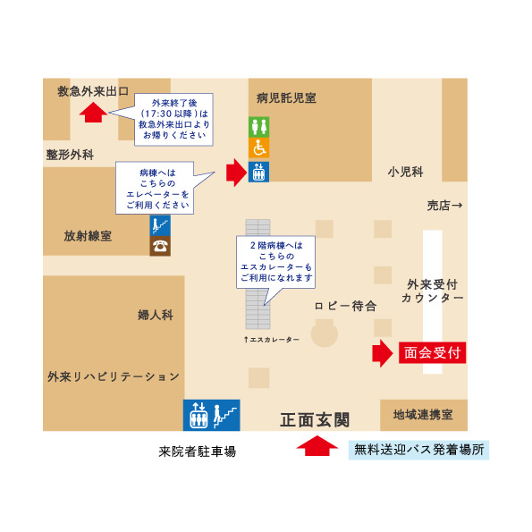 17:30以降の外来終了後、正面玄関は施錠しますのでお帰りの際は救急外来出口をご利用ください。