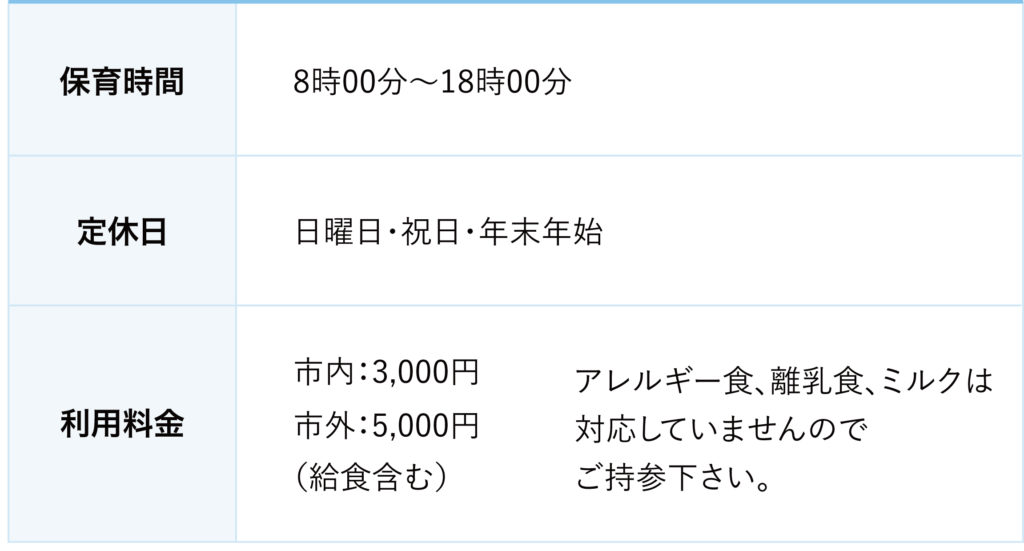 ・1歳2ヶ月以上でまだMR(麻疹・風疹)の予防接種が済んでいないお子さまはお預かり出来ません。